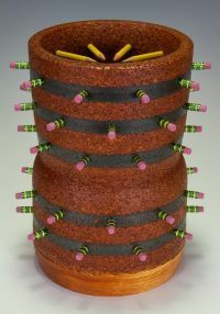 My interest in combining pencils, erasers, sanding disks, cork, Tampico Fiber, and other objects into my turned vessels/objects continues to hold my interest. With these objects and images, I strive to make my work challenging, intriguing, compelling, inspiring, and beautiful.